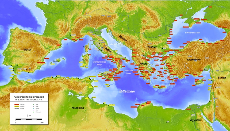 [Bu haritayı çok büyük olarak okuyabilmenin yanısıra başka haritalar ve açıklamalar için bkz: < www.en.wikipedia.org/wiki/Colonies_in_antiquity>. (Maalesef Türkçesi yok).]