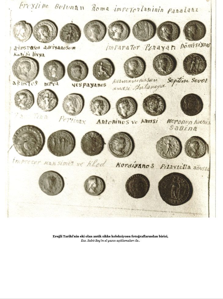 Birinci Cildin eki olduğu İçindekiler kısmında belirtilen Haritalar ve Resimler ise, yaşamı boyunca topladığı ve daha sonra amcam Ecz. Orhan Bey tarafından Ereğli ve İstanbul Arkeoloji Müzelerine bağışlanan zengin antik sikke koleksiyonundan bazı örnekleri içeren ‘Ereğli’de Çıkan Çeşitli Paralar’, ‘Ereğli Sitesi’nin Bastırdığı Paralar’ ve ‘Roma ve Bizans’a Ait Paralar’ olarak adlandırdığı 4 fotoğraf ve bugün elimizde olmayan ‘Ereğli Sitesi’nin Haritası(No:4)’, ‘Ereğli’nin Rıhtım, Liman ve Kalelerinin Planı (No:2-4)’ ve ‘Ereğli Akropolünün Planı’ olarak adlandırdığı 3 adet harita ve plandır.