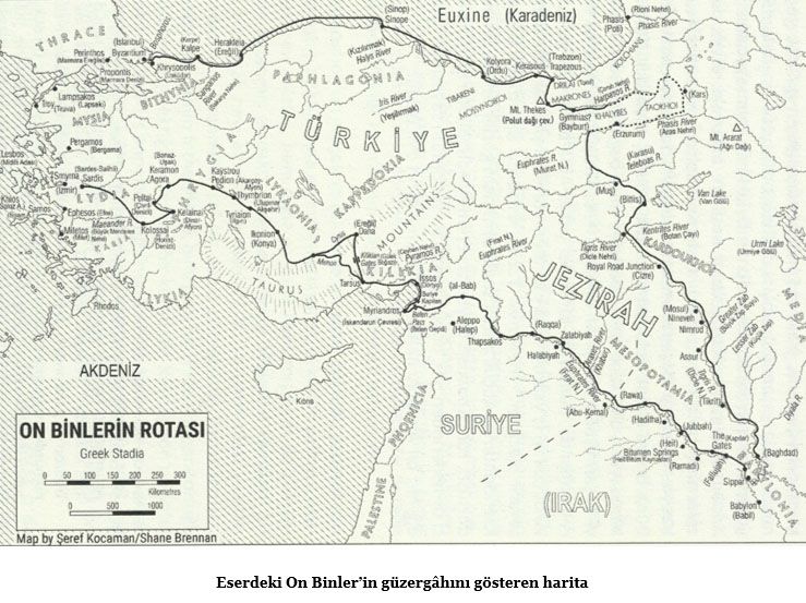 “Bu kitap, MÖ 401 yılında Batı Anadolu kıyılarından iç kesimlere doğru sefere çıkan bir paralı asker ordusunun günümüzdeki izlerini arayış öyküsüdür1. Askerlere yalan söylenmiş, yerel bir kavim olan Pisidialıları2 topraklarından kovmak üzere sefere çıkıldığı anlatılmıştır. Oysa orduya komutanlık eden Pers prensi Genç Kyros’un dillendirdiğinden çok daha gözüpek bir amacı vardır. Ordusuyla Babil'e kadar gidip, ağabeyi Büyük Kral’ı tahtından indirmeyi istemektedir3. “On Binler” adıyla anılan askerlerin sıradışı maceraları, içlerinden biri olan Atinalı Ksenophon tarafından yazıya dökülmüştür. Anabasis Kyrou (“Kyros’un Tırmanışı”) adlı bu kitabı kendime rehber edinerek, 2000 yılının Mayıs ayında, orduyla aynı yerden yolculuğuma başladım. Amacım Ksenophon’un tanıttığı yolun ne derece izlenebilir olduğunu saptamak ve betimlediği yerlerden günümüze kalan izler olup olmadığını bulmaktı. Her iki amacımı da beklediğimin ötesinde bir doğruluk payı ile gerçekleştirdiğimiz söyleyebilirim. Akşehir yakınlarında bir yol kenarında çağıldayan çeşme (Anabasis 1. 2. 13), Suriye'nin deniz kadar pürüzsüz düzlükleri (Anabasis 1. 5. 1) ve Irak’ta Dicle kıyısında bulunan tarihî kalıntılar (Anabasis 3. 4. 7) gibi göze çarpan bazı yerler, Ksenophon’un anlattığı zamanlardan bu yana, 2500 yıl boyunca hiç değişmeden duruyordu. Benzer biçimde Ksenophon’un ayrıntılara olağanüstü bir özen göstererek tuttuğu sefer kayıtlarının da olabildiğince izlenebilir durumda olduğunu gördüm. Seferin her bir durak noktasını anlatmış, ordunun aştığı her bir uzaklığı belirtmişti kitabında. Günümüz coğrafyasıyla neredeyse tümüyle örtüşüyordu bu bilgiler. Sardes’ten başlayıp Babil'e gittiğim ve oradan da İstanbul'a döndüğüm kendi yolculuğum, 15 ay sürdü. Toplamda 5500 km yol yürümüştüm ki bu, Ksenophon’un dediği rakamlarla neredeyse birebir örtüşüyordu.