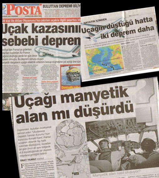 Uçağın düştüğü o aynı bölgede 24 saat öncesinde 4.8 kuvvatinde bir deprem meydana gelmişti. Dünyada bu konuyu masaya yatıran yegane araştırmacı ben olmuştum. Aslında depremin kuvveti o kadar önemli değildi, deprem olmadan önce, olduğu zaman ve olduktan birkaç gün içerisinde meydana gelen elektromagnetik sinyaller, bozulmuş elektronların atmosfere yayılması ve en önemlisi bir de air iyonlarının su damlacıkları yapmalarıyla ve bu su damlacıklarının irtifa arttığında hemen buzlanması önemliydi. Bu konuıda aşağıda açıklık getireceğim. (RESİM 001)