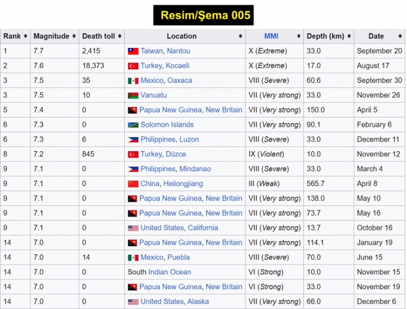 Aşağıdaki listede dünyamızda meydana gelen Mag 7.0 üzerindeki 18 depremi göstermektedir. Ölü sayısı tamamen yalnış olup göz önünde bulundurmamnız lazım. (Resim/Şema 005) (Resim 006)