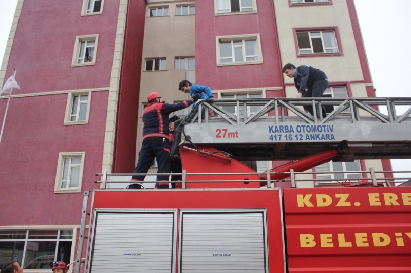Binadan binaya iple geçiş yapan itfaiye ekipleri, öğrencilerden alkış alırken, temsili çıkarılan yangına itfaiye ekipleri müdahale etti. Yangında yaralanan kişilerin ise tedavisi okul bahçesine gelen özel hastane ambulansında görevli sağlık personeli tarafından yapıldı.