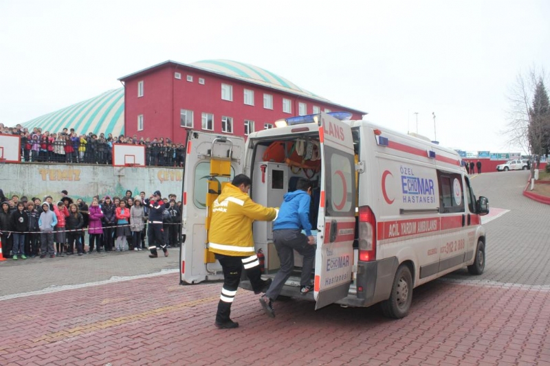 Binadan binaya iple geçiş yapan itfaiye ekipleri, öğrencilerden alkış alırken, temsili çıkarılan yangına itfaiye ekipleri müdahale etti. Yangında yaralanan kişilerin ise tedavisi okul bahçesine gelen özel hastane ambulansında görevli sağlık personeli tarafından yapıldı.