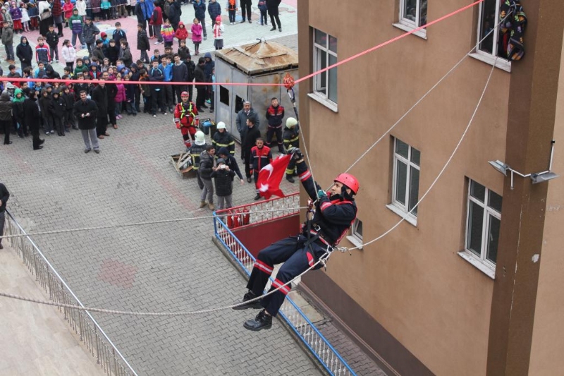 Binadan binaya iple geçiş yapan itfaiye ekipleri, öğrencilerden alkış alırken, temsili çıkarılan yangına itfaiye ekipleri müdahale etti. Yangında yaralanan kişilerin ise tedavisi okul bahçesine gelen özel hastane ambulansında görevli sağlık personeli tarafından yapıldı.