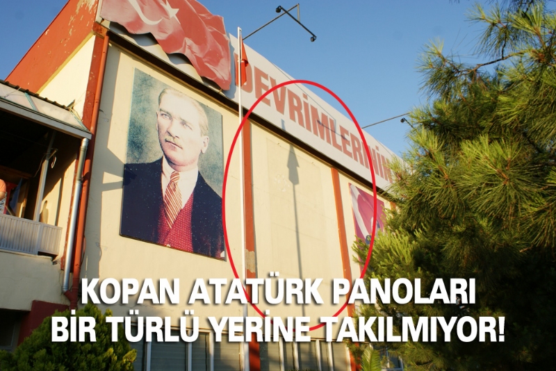 AKM'nin (Atatürk Kültür Merkezi) yola bakan kısmında sıra sıra kendine yer bulan Atatürk posterlerinin bazıları geçtiğimiz hafta çıkan şiddetli rüzgarlardan sonra yerinden kopmuştu. Mevcut AKP'li Belediye "nasıl olsa çok resim var. Ha bir eksik ha bir fazla kimse anlamaz" mantığı ile mi bilinmez halen yerinden koptuğu sanılan dev panoları bir türlü yerine takmıyor.