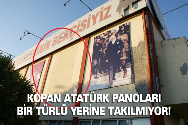 AKM'nin (Atatürk Kültür Merkezi) yola bakan kısmında sıra sıra kendine yer bulan Atatürk posterlerinin bazıları geçtiğimiz hafta çıkan şiddetli rüzgarlardan sonra yerinden kopmuştu. Mevcut AKP'li Belediye "nasıl olsa çok resim var. Ha bir eksik ha bir fazla kimse anlamaz" mantığı ile mi bilinmez halen yerinden koptuğu sanılan dev panoları bir türlü yerine takmıyor.