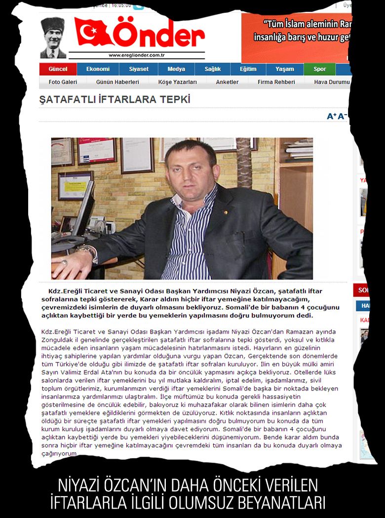 Niyazi ÖZCAN bu kentin yeri geldiğinde çok doğru tespitler yapabilen bir kişiliği. Ancak dün söyledikleri ile bugün o söylediklerinin tam tersi bir tutum içine girmiş olması düşündürücüdür. Bugüne kadar söylediği ve yaptığı her uyarı yerel basın olarak yayın organlarımızda geniş yer bulabiliyorken, ÖZCANîn mübarek ay olan Ramazan ayında bir iftar programını kullanarak yapması ise ayrı bir konu olarak karşımıza çıkıyor. Üstelik daha önce yaptığı basın açıklamaları basın tarafından harfiyen kamuoyuna ulaştırılırken ÖZCAN'ın iftar programını bu tür söylemleri için kullanmasının altında neyin yattığı ise merak konusu.