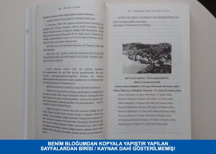 8 Aralık 2007 Cumartesi günü Kdz. Ereğli sayfası bloğumda yayınladığım Hacı Baba Türbesi ve Göztepe ile ilgili belediyeye de sunduğum 9 adet kaynak Recep beyin kitabında bloğumdan aynı şekilde aynı sırayla harf karakterleri bile yeniden düzenlemeden bloğum kaynak gösterilmeden kullanılmış işin ilginci bu intihal nedense aynı kitapta 2 kere tekrarlanmış sayfa 43-47 sayfa 297-301 hatta burada “GÖZTEPE’DE YATAN KOLONİZATÖR BİR DERVİŞ” adlı konu başlığım ve kullandığım görsel bile yine aynı şekilde kaynak verilmeden kullanılmıştır. Kitap içinde benim bloğumdan görseller kaynağı gösterilmeden kullanılmıştır.( Örnek143. Sayfa Tunalı Hilmi Fotoğrafı 29 Ekim 2012 de bloğumda yayınladığım ile aynıdır. Vikipedia’yı kaynak göstermiş ama oradaki görsel farklıdır. Yine kitapta sayfa 183’te yayınlanan Tahsin Aygün’ün fotoğrafı ilk defa 4 Kasım 2011 de bloğumda yayınlanmıştır bu alanda ilk ve orijinaldir.)