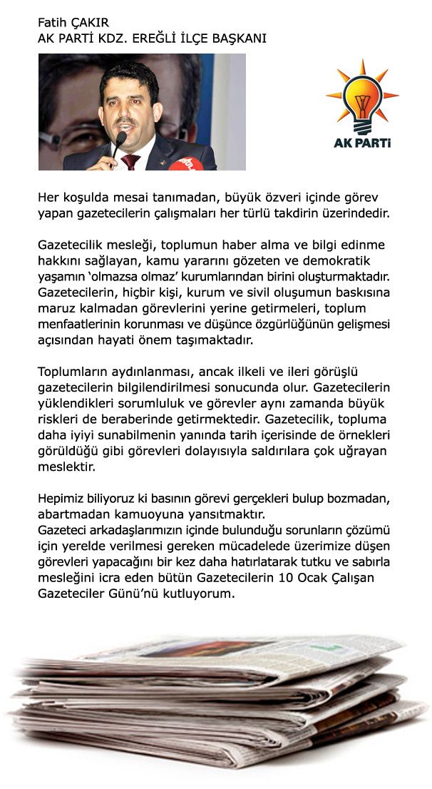 tüm gazetecilerin ve ereğli gazetelerinin gazeteciler gününü tebrik ederim özgülükler sizlerin olsun.