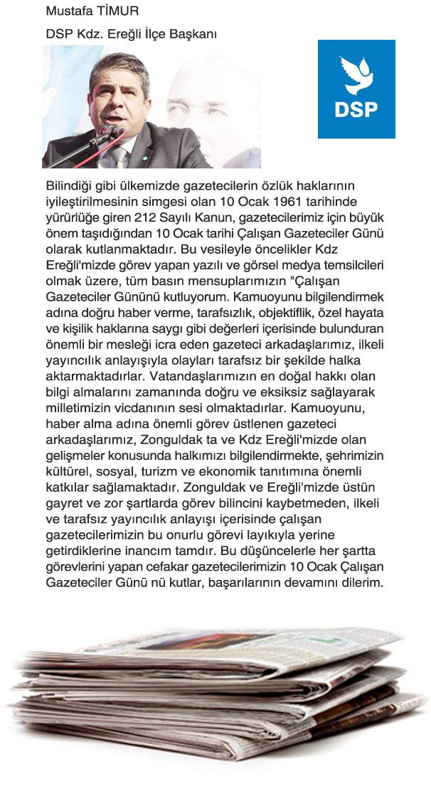 tüm gazetecilerin ve ereğli gazetelerinin gazeteciler gününü tebrik ederim özgülükler sizlerin olsun.
