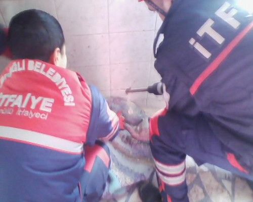 Ereğli'de kafası su giderine sıkışan kedi itfaiye ekiplerinin duvarı kırması ile kurtarıldı. Hilti ile kırılan duvardan kopan parçaların kediye zarar vermemesi için kedinin üzeri battaniye ile kapatıldı.