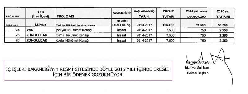 İÇ İŞLERİ BAKANLIĞI'nın RESMİ SİTESİNDE BÖYLE 2015 YILI İÇİNDE EREĞLİ İÇİN BİR ÖDENEK GÖZÜKMÜYOR