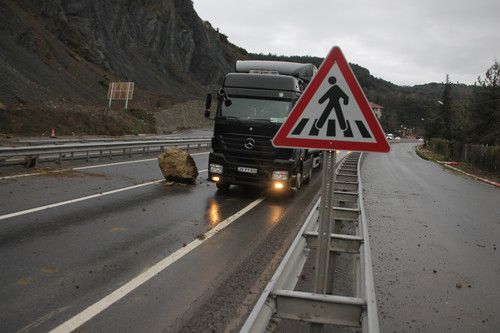 Ereğli'de sabah saatlerinde meydana gelen heyelanda dağdan kopan kaya parçaları yola yuvarlandı. Yaklaşık 2 tonluk kaya, orta bariyerleri ezerek karşı şeride geçti. Heyelanın sabah saatlerinde meydana gelmesi olası bir faciayı da önlemiş oldu.