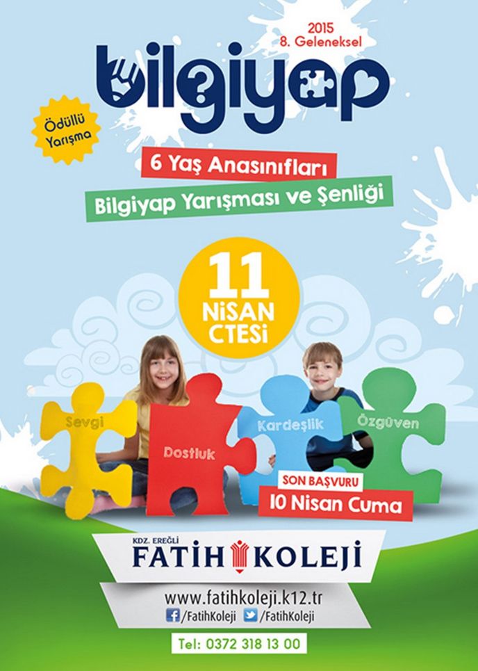 Fatih Kolejinden yapılan yazılı açıklama da 6 yaş Ana sınıfları öğrencilerinin katılacağı Bilgi ve yapboz (BİLGİYAP) yarışması 11 Nisan 2015 Cumartesi günü yapılacak. Son başvuru tarihinin 10 Nisan 2015 Cuma günü olduğu belirtilen yarışmada dereceye giren öğrenci, öğretmen ve okullara da çeşitli hediyelerin verileceği açıklandı. Başvuru için 03723181300 numaralı telefondan bilgi alınabileceği de ifade edildi.