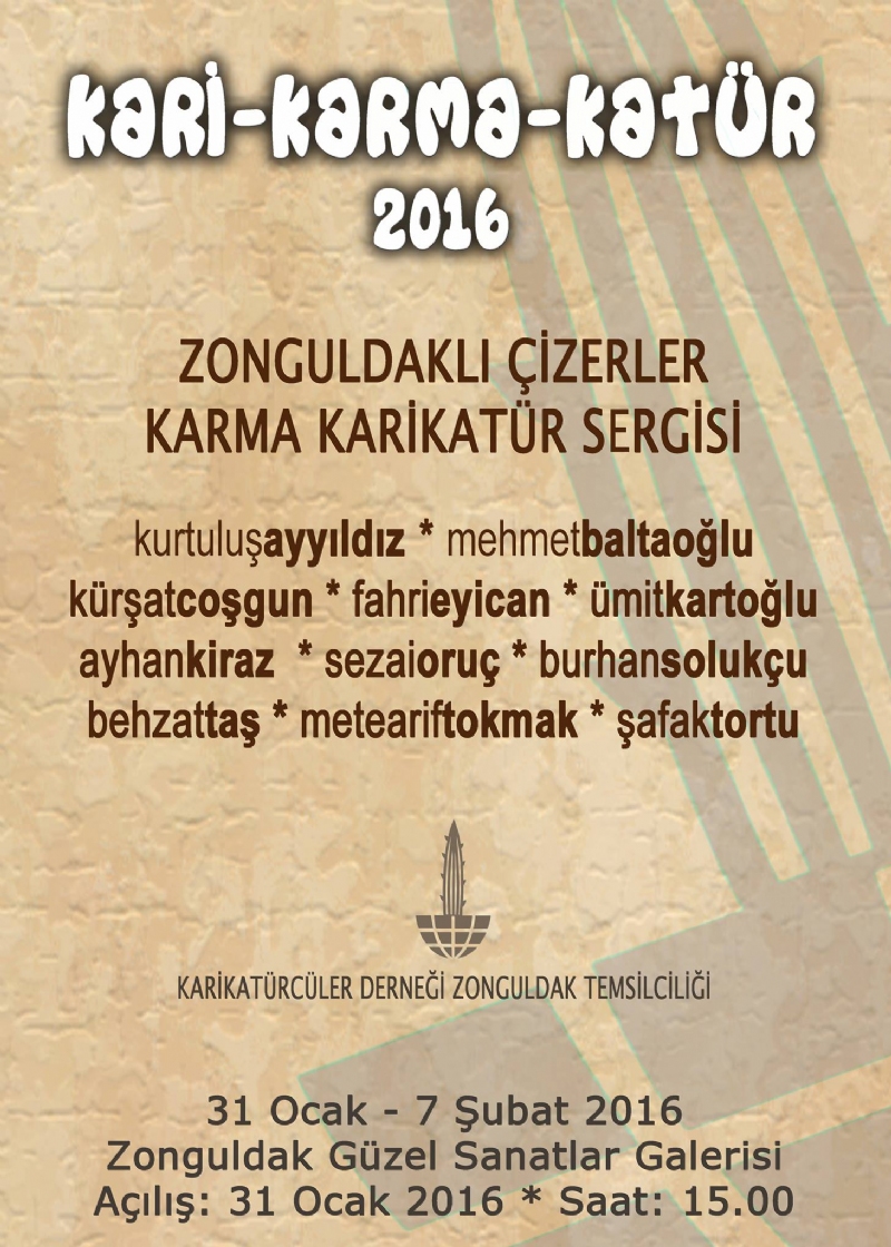 Karikatürcüler Derneği Zonguldak temsilciliği tarafından hazırlanan ve bu yılın ilk etkinliği olacak KARİ-KARMA-KATÜR SERGİSİ 31 Ocak 2016 - 7 şubat 2016 tarihleri arasında ziyaretçilere açık olacak.