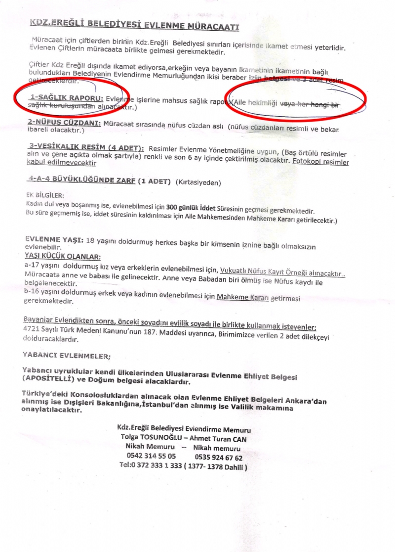 Evlenmek için Ereğli Belediyesi Nikah Memurluğuna başvuran evlenecek çiftlere verilen "KDZ EREĞLİ EVLEDİRME MÜRACAATI" belgesinde evlenmek için istenilen belgelerin arasında bulunan SAĞLIK RAPORU alma işi zorlaştırılıyor.