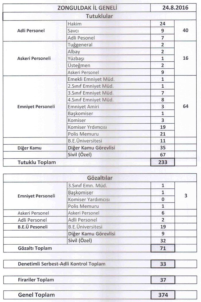 Zonguldak Valiliği Basın ve Halkla İlişkiler Müdürlüğü “OHAL Bürosu 3. Nolu Açıklamasını” gönderdi. 15 Temmuz akşamı yaşanan “ülkemizdeki Anayasal düzeni cebir ve şiddet kullanarak ortadan kaldırmaya yönelik” hain ve kanlı darbe girişiminin andından Zonguldak’ta kolluk kuvvetleri tarafından sürdürülen çalışmalarda 40’ı savcı ve adliye personeli olmak üzere, toplamda 233 kişinin tutuklandığı açıklandı. OHAL’ın açıklamasındaki güncel bilgilerine göre: "33 kişinin denetimli serbestlikle salıverildiği, 37 kişinin firari durumda ve aranıyor. 71 kişinin gözaltında olup, savcılığa gönderilmeyi beklediği soruşturmalar yoğun bir şekilde devam ettiği " bilgisine yer verildi.