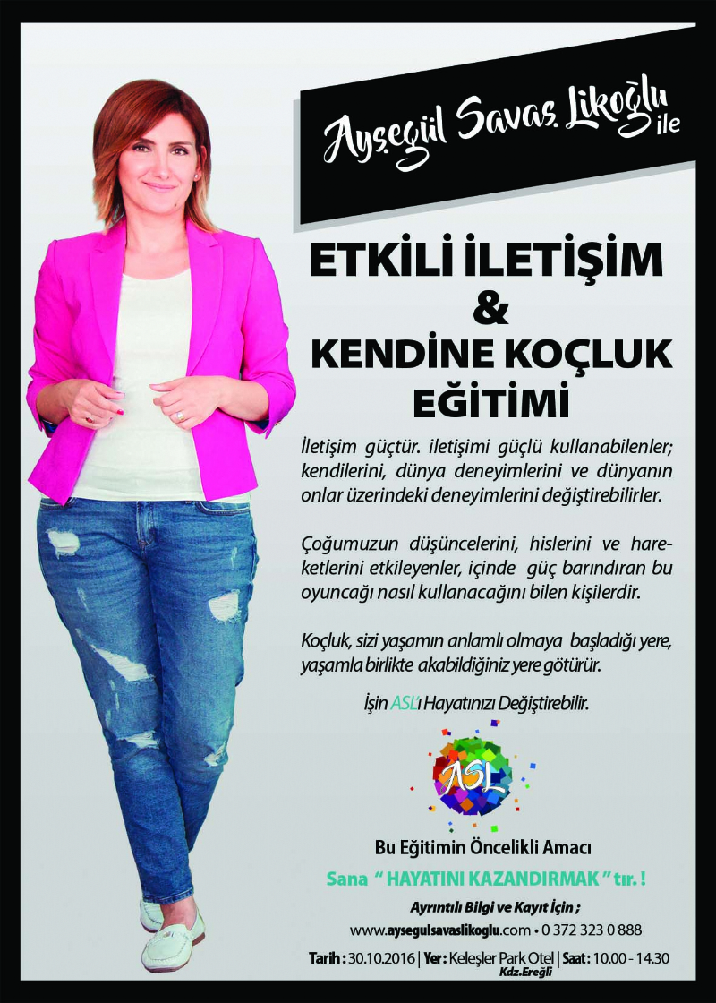 “Etkili iletişim ve Kendine Koçluk” konulu eğitim 30 Ekim 2016’da Keleşler Park Otel’de Ayşegül Savaş Likoğlu eğitmenliğinde düzenleneceği bildirildi.