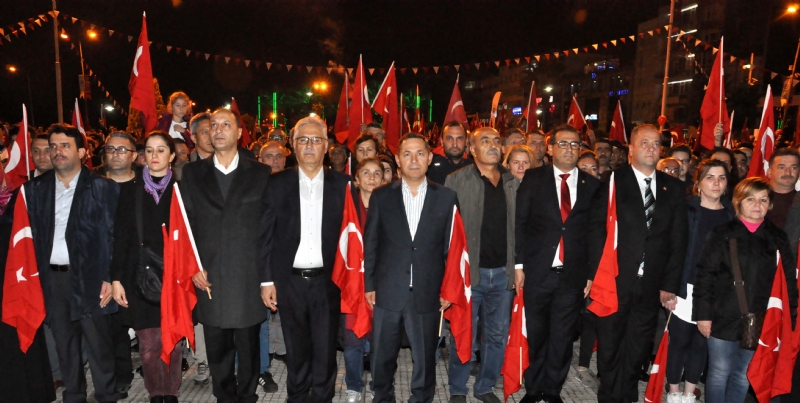 Bağlık Polis Karakolu önünden marşlarla başlayan yürüyüşe katılan protokol, siyasi partilerin ve sivil toplum kuruluşlarının temsilcileri ve ilçe halkı, ‘Ne mutlu Türküm diyene’ sloganları atarak, Atatürk Anıtı önüne kadar yürüdü.