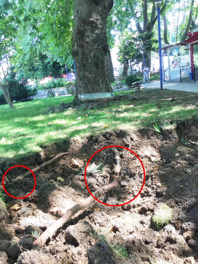 Başkan UYSAL bu sefer de toprağı kazarken Tarihi Çınarların kökleri ile karşı karşıya geldi. Tarihi çınarların köklerini acımasızca koparan belediye çalışanları toprağı da o şekilde açık bırakarak paydos ettikleri görüldü.