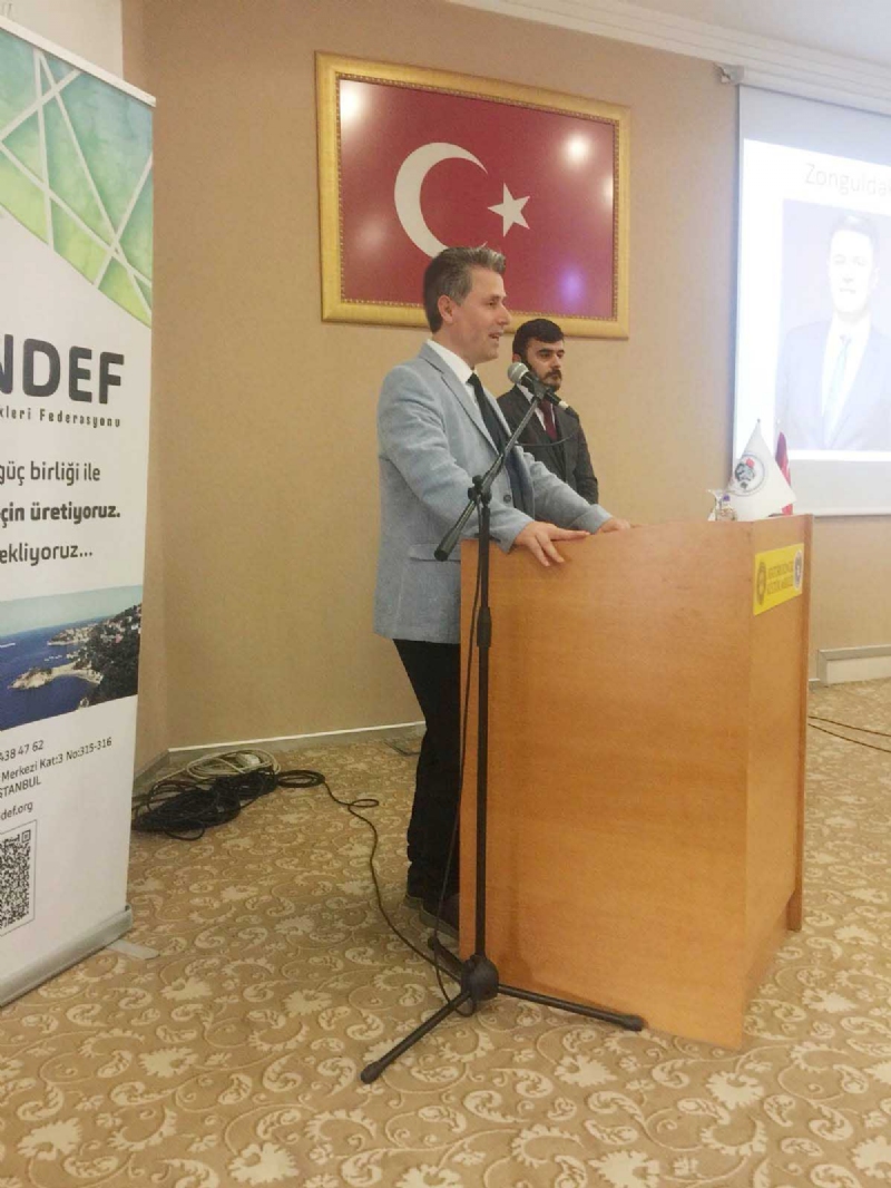 “Bizler Zonguldaklılar olarak artık her yerdeyiz. Birçok kulvarda yerimizi almaya başladık ve bunu çok hızlı yapıyoruz. Biz birlikte güçlüyüz derken de bugün olduğu gibi salonlara sığmıyoruz. Bir etkinlik için şehir dışından kalkıp gelebiliyorsak birçok şeyi de başarmışız demektir. Özellikle gençlerimiz çok önemli. Aday Adayı olan değerli kardeşim Efekan Durhan’ı tebrik ediyorum.ZONDEF olarak tüm Zonguldaklıların özellikle gençlerin yanındayız. Ve destek vermeye devam edeceğiz. Yine ZONDEF sanayi Ticaret Komisyonu başkanımız Samet Eren’de genç bir kardeşimiz onun da yolunun açık olması için tüm gayretlerimizi göstereceğiz.İkincisini düzenlemiş olduğumuz Zonguldak’ın Değerleri Buluşuyor konferans ve çalıştayına katılımın yüksek olması da beni ayrıca sevindirdi. Bir Zonguldaklı hemşerimizin bakış açısını değiştirip,ufkunu açabilirsek kendimizi başarılı hissedeceğiz. İl Başkan yardımcımız değerli hemşerimiz Tuncay Kiraz’a ayrıca teşekkür ederim. Gönlü ve imkânlarıyla bizlerin yani Zonguldaklıların yanında olması bizleri onurlandırdı ve gururlandırdı.Çok değerli dernek başkanlarım Abdullah Kavşur ve Deniz Durhan’a da göstermiş oldukları samimiyet ve çabalardan dolayı çok çok teşekkür ediyorum.Bursa’da kimseyi ayrıştırmadan destek vermeleri ve Zonguldaklıların gelişmesi adına yaptıkları hizmetlerden dolayı da birkez daha teşekkürlerimizi borç biliriz.Bizler ZONDEF olarak her zaman yanlarında olduğumuzu bildirmek isteriz.Bizler ZONDEF olarak her daim doğrunun,dürüstlüğün yanında olmaya da devem edeceğiz.Burada az sonra 3 Zonguldak’ın değerini dinleyeceğiz.Ben de eminim ki çok şey öğreneceğim.Bizler ZONDEF sanayi ve Ticaret Komisyonunun önderliğinde Zonguldakın değerlerini sizlerle buluşturmaya devam edeceğiz.Dediğimiz gibi Zonguldak ve Zonguldaklı için daha gidilecek çok YOLUMUZ ve yapılacak çok İŞİMİZ var.” Dedi.