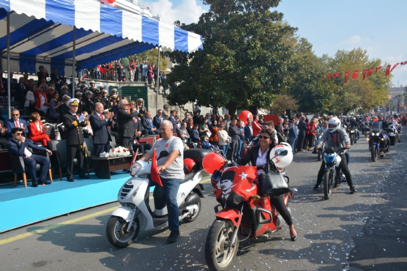 Kaymakam, Amiral ve Belediye Başkanının askeri araç içerisinde alanı dolduranların bayramını kutladığı program İstiklal Marşı'nın okunması ile sürdü. Kaymakam Çorumluoğlu, törende yaptığı konuşmada, ortak hedefin herkesin demokrasi ve hürriyet içerisinde yaşadığı, hak ve özgürlüklerin evrensel standarda ulaştığı bir Türkiye olduğunu söyledi.