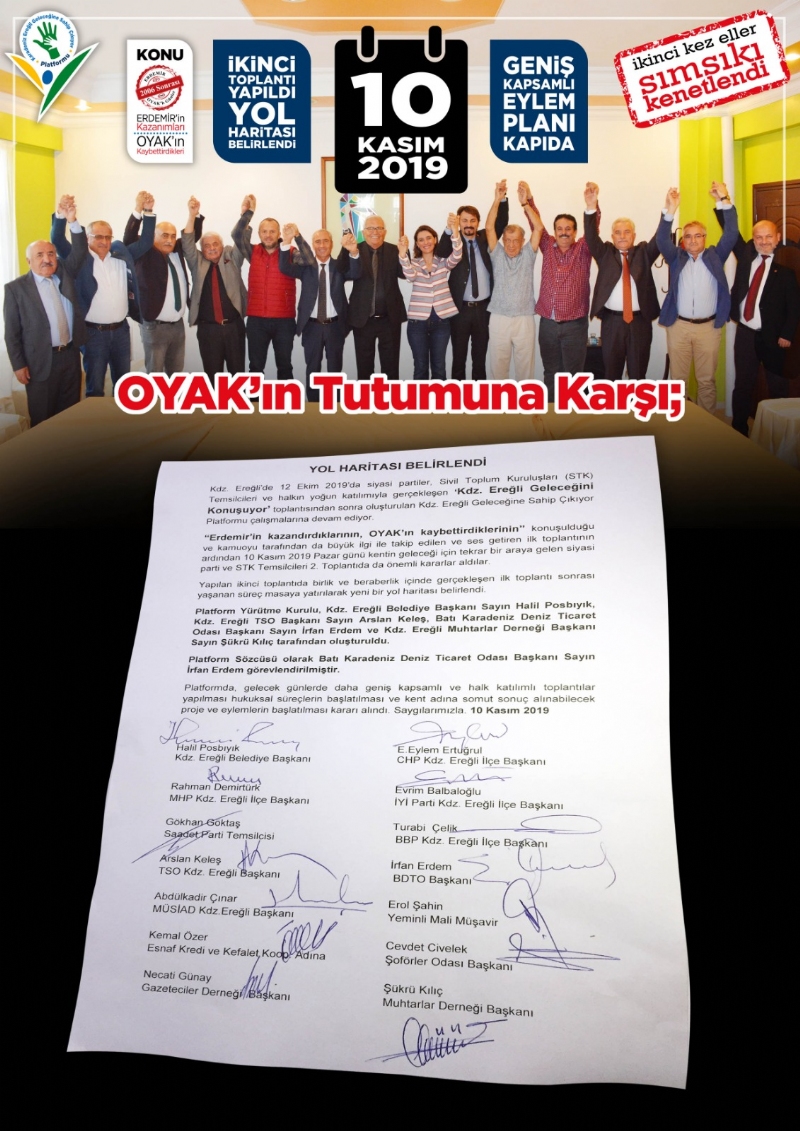 Platformda OYAK’ın Ereğli’ye karşı tutumunun değişmemesi halinde, gelecek günlerde daha geniş kapsamlı ve halk katılımlı toplantılar yapılması, hukuksal süreçlerin başlatılması ve kent adına somut sonuç odaklı proje ve demokratik eylemlerin başlatılması kararı alındı.