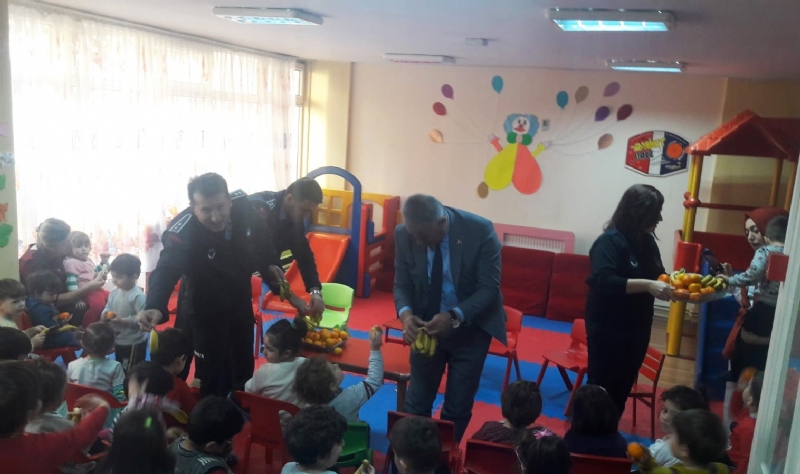 Zabıta Müdürü Halit Aydın ve zabıta ekipleri daha sonra Belediye Kreşi’ne geçerek öğrencilere yerli muz ve mandalina ikram etti. Aydın, yerli ürünlerinin kullanılmasının önemi hakkında bilgi verdi.
