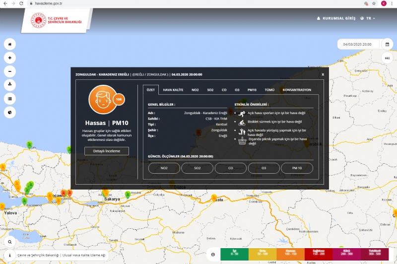 Çevre ve Şehircilik Bakanlığı, www.havaizleme.gov.tr adresinden tüm illerin hava kalitesini ve havadaki partikül, zararlı madde ve toz oranlarını anlık olarak yayınlıyor. Bakanlığın bugün yayınladığı verilere göz attığımızda, Ereğli’de hava kalitesinin iyice kötüleştiği anlaşılıyor.