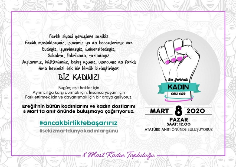 Posbıyık “Ereğli'de kadınlar 8 Mart için bir araya geldi. Atatürk'e mektupları var. Haydi gelin seslerine kulak verelim. Pazar günü 12.00'de Atatürk Anıtı önünde buluşalım. Kalbim, desteğim ve dostluğum onlarla. Orada olacağım. Hep beraber buluşalım” dedi.
