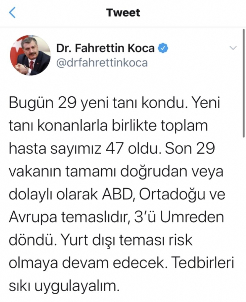 Bakan Koca, “Bugün 29 yeni tanı kondu. Yeni tanı konanlarla birlikte toplam hasta sayımız 47 oldu. Son 29 vakanın tamamı doğrudan veya dolaylı olarak ABD, Ortadoğu ve Avrupa temaslıdır, 3’ü Umreden döndü. Yurt dışı teması risk olmaya devam edecek. Tedbirleri sıkı uygulayalım” dedi.