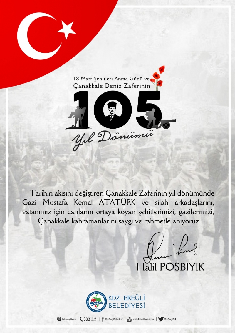 Kdz. Ereğli Belediye Başkanı Halil Posbıyık, 18 Mart Şehitler Günü ve Çanakkale Deniz Zaferi’nin 105’inci yıl dönümünde bir mesaj yayımladı. Başkan Posbıyık, mesajında şu görüşlere yer verdi;