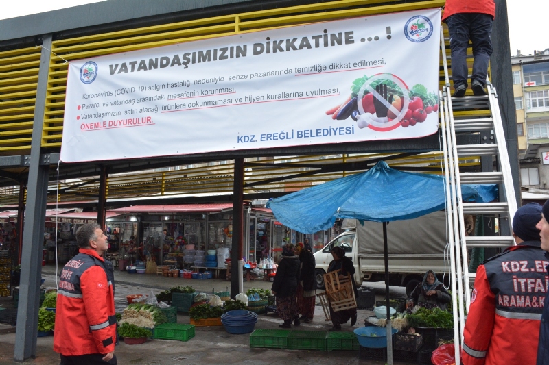 Kdz. Ereğli Belediyesi koronavirüs (Kovid-19) salgınından vatandaşları korumak ve salgının yayılmasını engellemek amacıyla önlemlerini sürdürüyor. İlçedeki pazar yerlerinde çalışanlara eldiven ve el dezenfektanı dağıtıldı, bilgilendirme afişleri asıldı. Uygulama semt pazarlarında da devam edecek.