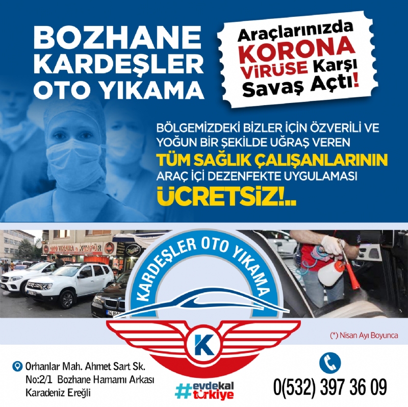 Kdz. Ereğli Bozhane mevkiinde oto yıkama işletmeciliği yapan Kardeşler Oto Yıkama ülkemizdeki korona seferberliği çerçevesinde “Gün Dayanışma Günü…” diyerek tüm sağlık çalışanlarının araçlarını Nisan ayı sonuna kadar ücretsiz koronaya karşı dezenfekte edecek.