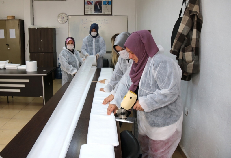 Belediyeden arkadaşlarımız araştırdı, maske üretimi için gerekli özel koruyucu kumaşı ve gerekli diğer malzemeleri sağladık. Standartları konusunda teknik bilgileri aldık. Hijyen ortamda, uygun ölçülerde nitelikte üretim ve paketleme yapılıyor. Belediye olarak gerekli bütün kaynağı ayırıyoruz.