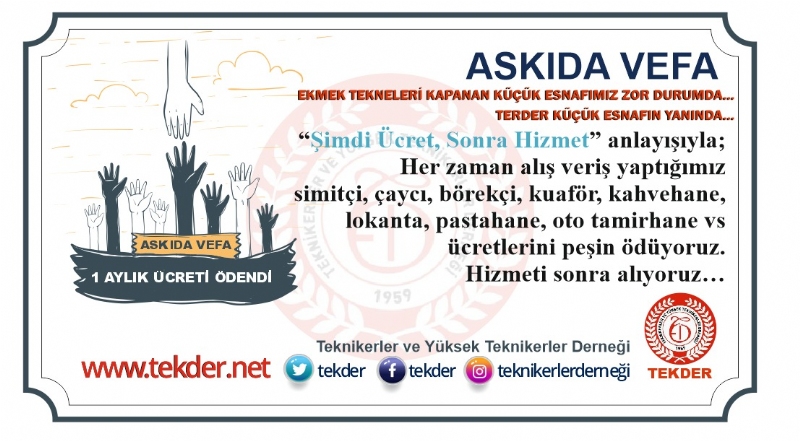 Teknikerler ve Yüksek Teknikerler Derneği (TEKDER) tüm dünyaya yayılan Covid-19 salgınıyla ilgili Türkiye'de alınan tedbirler kapsamında iş yerleri geçici olarak kapatılan küçük esnafa destek olmak amacıyla "Askıda vefa" kampanyası başlatıldığını duyurdu.