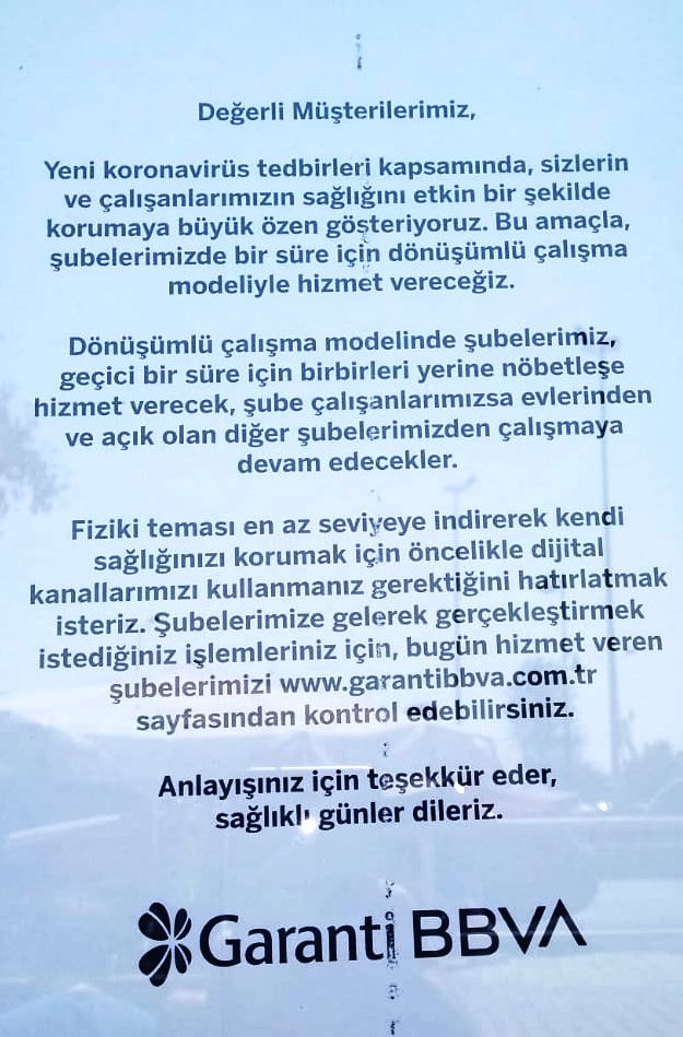 Garanti Bankası'nın Kdz. Ereğli Merkez ve Alaplı Şubeleri, koronavirüs tedbirleri kapsamında kapatıldı. Dönüşümlü Çalışma Modeli uygulayacağını duyuran banka, söz konusu çalışma sistemine ilişkin bilgilendirme yazılarını kapatılan şubelerin camlarına astı. Garanti Bankası Kdz. Ereğli Merkez Şubesi'nin camlarına yapıştırılan duyuruda, şubelerin nöbetleşe hizmet vereceği, çalışanların ise evlerinden yada açık olan diğer şubelerde çalışmaya devam edecekleri belirtildi.