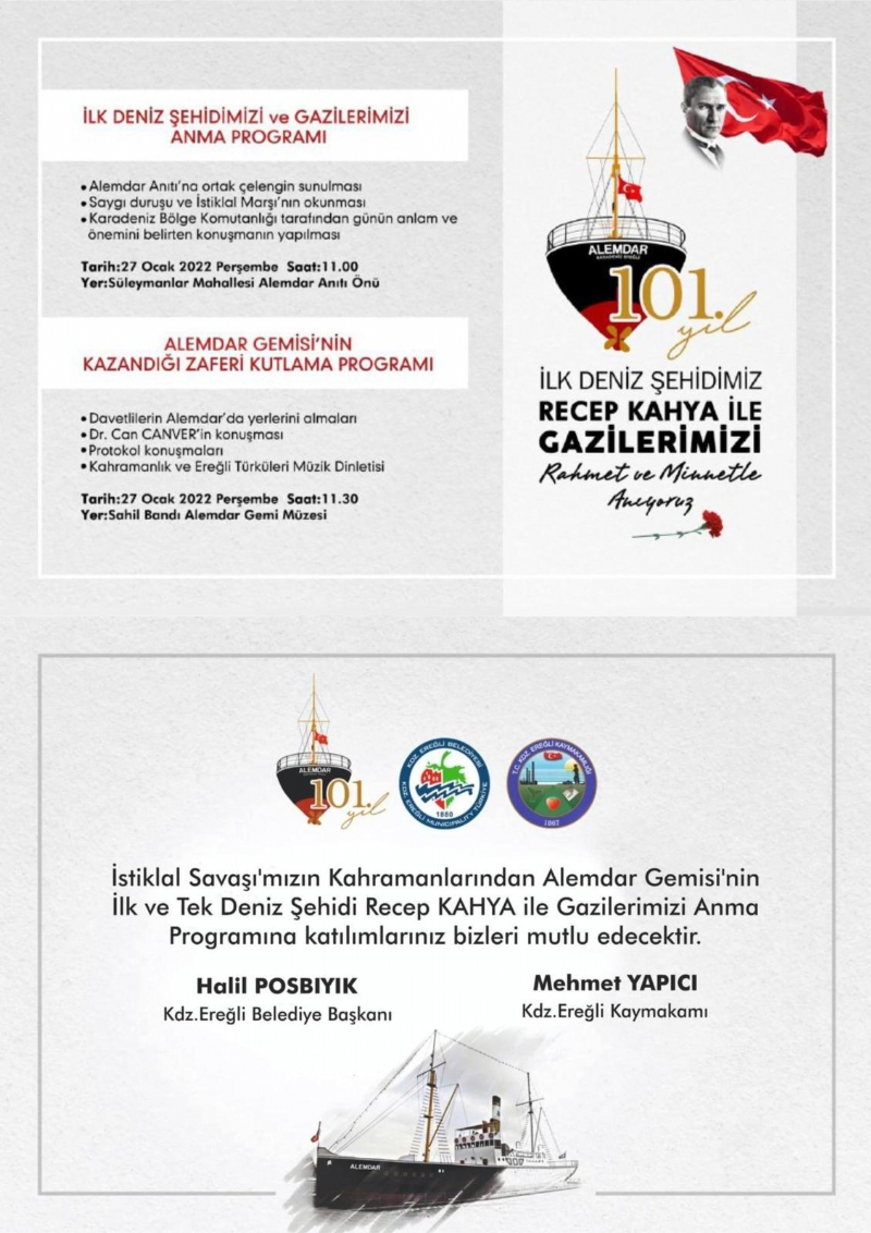 KDZ.Ereğli Kaymakamlığı’ndan yapılan duyuruya göre; İstiklal Savaşı’nın ilk deniz şehidi Recep Kahya’yı anma ve Alemdar Gemisi’nin Karadeniz Ereğli’ye ve burada yaşanan istiklal mücadelesini konu alan tören düzenleneceği bildirildi.