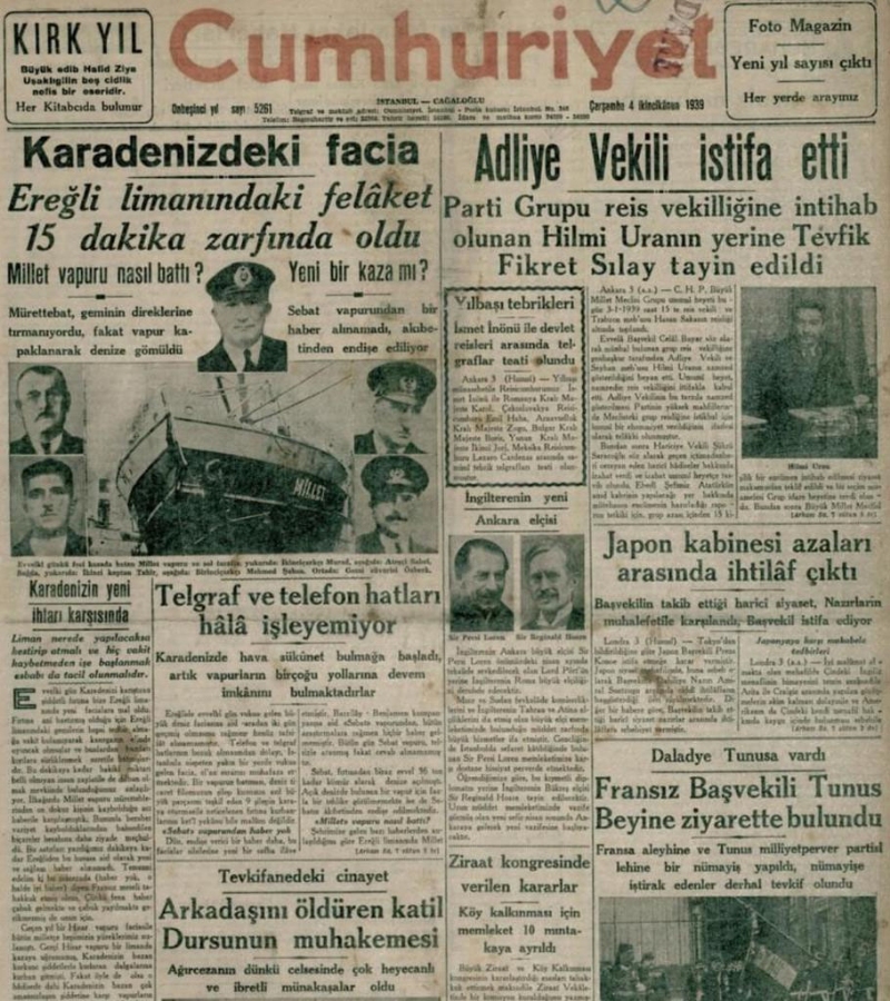 2 Ocak 1939 gecesi başlayıp saat 4,30 da kar tipisi ile batı karayeline çeviren şiddetli fırtına Zonguldak sahillerinde gemilerin barınmasını mümkün kılmamış olup havanın değişiminden evvel barınmak üzere Millet, Sümer, Kaplan, Galata, Zonguldak, Samsun, İkbal, Şadan, Tan ve Yunan bandıralı Nikolaus Namikos isimli vapurların sığındıkları Ereğli limanında dalgaların büyümesi tipi ve sisin gittikçe artan yoğunluğu fırtına ile birleşince bu vapurların da tehlikeye düşmelerine sebep olmuş bazıları demirini taratmak ve bazısı da bırakmak sureti ile sahilin müsait yerlerine ulaşmışlar ve mürettebatı da kurtarma sandalları yardımı ile sağ salim karaya çıkarılmışlardır.