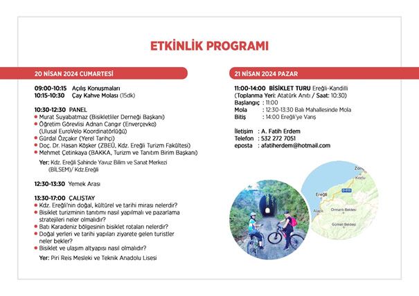 • Konularında uzman panelistlerin yer aldığı Bisiklet ve Turizm Paneli 20 Nisan Cumartesi saat 09:00 12:30 tarihinde Kdz. Ereğli Şahinde Yavuz Bilim ve Sanat Merkezi (BİLSEM) Konferans Salonunda gerçekleştirilecektir.