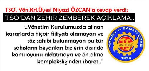 TSO Yönetim Kurulu Üyesi ve Ereğli Mücadele Platformu sözcüsü Niyazi Özcan'ın dün TSO; Erdemir ve Belediye Yönetimi için yaptığı açıklamara bugün TSO'dan zehir zemberek bir yanıt geldi.