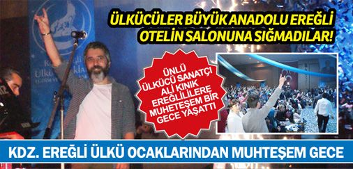 Kdz. Ereğli Ülkü Ocakları 14 Mayıs Perşembe akşamı Büyük Anadolu Ereğli Otelde düzenledikleri ZAFERE YÜRÜYÜZ GECESİ ve Ali KINIK konseri büyük ilgi gördü. Büyük Ereğli Anadolu Otel'in açıldığı günden bu yana büyük salonundaki yapılan organizasyonların en kalabalığına sahne olan Zafere Yürüyüş Gecesi'ne MHP Zonguldak Milletvekili adayları da katıldı.
