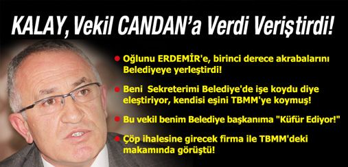 Oğlunu ERDEMİR'e, birinci derece akrabalarını Belediyeye yerleştirdi! Beni Sekreterimi Belediye'de işe koydu diye eleştiriyor, kendisi eşini TBMM'ye koymuş! Bu vekil benim Belediye başkanıma "Küfür Ediyor!" Çöp ihalesine girecek firma ile TBMM'deki makamında görüştü! AK Partili Meclis Üyesi Kalay, Milletvekili Candan'ı sert dille eleştirdi..