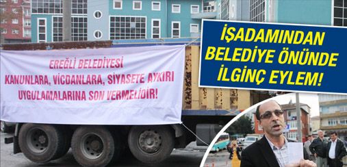 Ereğli Belediyesi'nden alacağı olduğunu ve Belediyespor Kulübü'ne yardım etmediği gerekçesi ile alacaklarını alamadığını iddia eden müteahhit firma sahibi, AK Partili belediye binası önüne üzerinde "Ereğli Belediyesi kanunlara, vicdanlara, siyasete aykırı uygulamalara son vermelidir" yazan kamyonu sokmak istedi. Polisin engel olduğu kamyon belediye önünden uzaklaştırıldı.