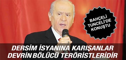 Bşbakan Ahmet DAVUTOĞLU'nun geçtiğimiz günlerdeki "Bu söylemelriniz Tunceli'de de söyleyin söyleyebiliyorsanız" şeklindeki meydan okurcasına sarfettiği sözler üzerine MHP Lideri Devlet Bahçeli Tunceli'ye giderek aynı sözleri orad da tekrarladı. Tunceli'ye ziyarette bulunan MHP Genel Başkanı Devlet Bahçeli, Dersim isyanına katılanların devrin bölücü teröristleri olduğunu söyledi. Bahçeli'nin bu sözleri valilik önünde bulunan bazı vatandaşlar tarafından protesto edilince kısa süreli gerginlik oluştu.