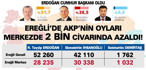 Cumhurbaşkanlığı seçimlerinde ülke genelinde yüzde 52'lik bir oranla Recep Tayyip Erdoğan ipi göğüsledi. 20 yıllık aradan sonra AK Partili Belediyeler arasına giren Ereğli Merkez'de ise AK Parti'nin oyları şaşılacak derecede düştü…