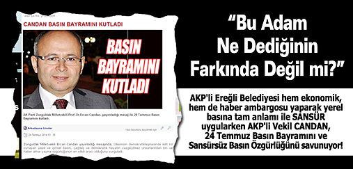AKP'li Ereğli Belediyesi hem ekonomik, hem de haber ambargosu yaparak yerel basına tam anlamı ile SANSÜR uygularken AKP'li Vekil CANDAN, 24 Temmuz Basın Bayramını ve Sansürsüz Basın Özgürlüğünü savunuyor!