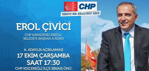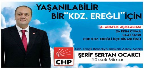 Mahalli Seçim’lerinde Karadeniz Ereğli Belediyesi’ni yeniden partiye katmak isteyen CHP Ereğli İlçe Örgütü’nde, bu sebeple geçtiğimiz gün başkanlık görevinden istifa eden Şerif Sertan Ocakcı’nın, aday adaylığı tanıtım toplantısı yapacağı bildirildi.
