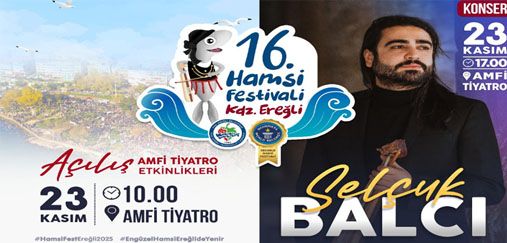 Kdz. Ereğli Belediyesi’nin 16 Kasım’da yapmayı planladığı ancak şehitlerimiz nedeniyle ertelediği 16. Hamsi Festivali 23 Kasım Pazar günü Ereğli sahilinde yapılacak. 10 tonun üzerinde hamsi, bin mangal, 4 bin ızgara, 5 ton kömür, 10 bin helva, 4 ton soğan, 10 bin ekmek, 30 kasa limon ve 10 bin adet suyun dağıtılacağı 16. Hamsi Festivali’nde STK ve derneklerde katılımda bulunarak Karadeniz’in sıcak insanı, kokusuyla, müziğiyle, paylaşma kültürüyle bir araya gelecek.