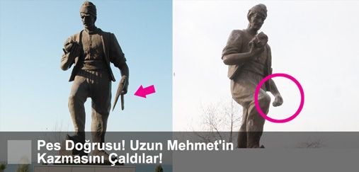 Ereğli sahil bandında dikili Uzun Mehmet anıtındaki 1 metrelik kazma çalındı. Olay polise bildirilmezken, yeni kazmanın siparişinin verildiği öğrenildi. Gazetecilerin, 'Heykelde eksik dikkatinizi çekiyor mu?' sorusuna bazı vatandaşlar kamera şakası zannedip hızla uzaklaşmayı tercih etti.